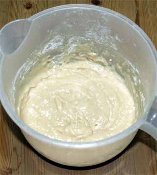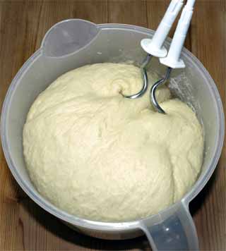 Wenn der Hefe-Vorteig gegangen ist, das restliche Mehl (200 g), 50 g Zucker, 50 weiche Butter, 1 Ei, 1 Eiweiß und eine Prise Salz dazu geben, und mit dem Handrührgerät (Knethaken) in 4 Minuten zu einem glatten Hefeteig kneten. Eventuell noch etwas Mehl oder Milch dazu geben, so dass ein weicher, von Hand formbarer Hefeteig entsteht. Den Hefeteig nochmals abgedeckt 45 Minuten gehen lassen.
