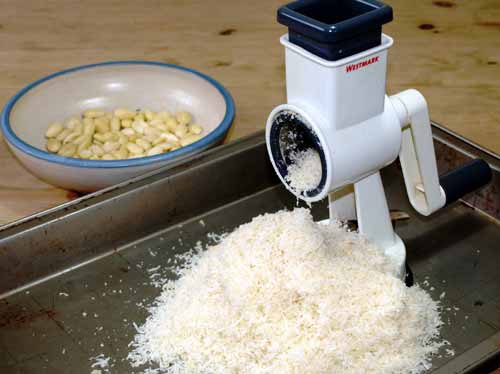 Zumindest wenn du die Macarons färben möchtest, solltest du gemahlene Mandeln aus geschälten Mandeln verwenden, damit die Macarons nicht wegen der Mandelschalen zu dunkel werden. Wenn du die Mandeln selbst mahlst, kannst du die Mandeln zwei Minuten in Wasser aufkochen, und dann die Mandelschalen abziehen. Die Mandeln sollten dann vor dem Mahlen gut getrocknet werden.
