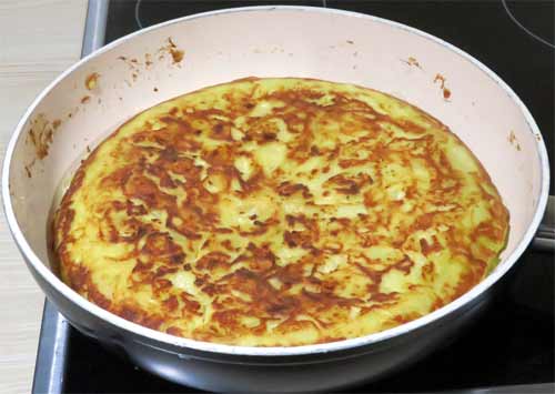 Die Tortilla bei mittlerer Hitze und abgedeckter Pfanne garen bis die Tortilla auch oben stockt, und die Tortilla am Boden